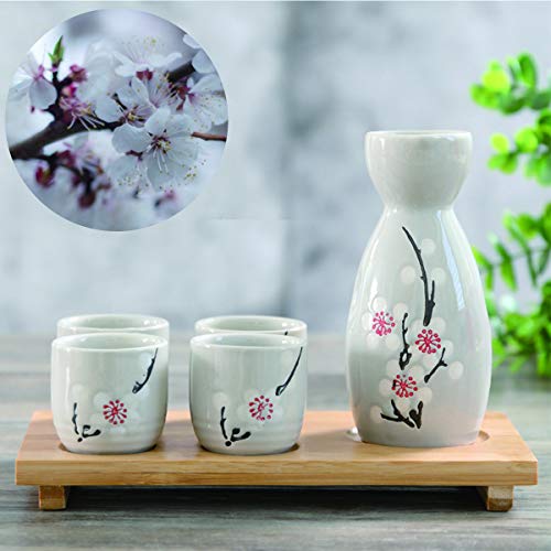 Liwein Sake Set keramiek, 5-delig, handbeschilderd, Japanse kersenbloesem, porselein, Sake beker, warme wijnpot, traditionele keramische mokken, wijnglazen, knutselen, geschenk, wit
